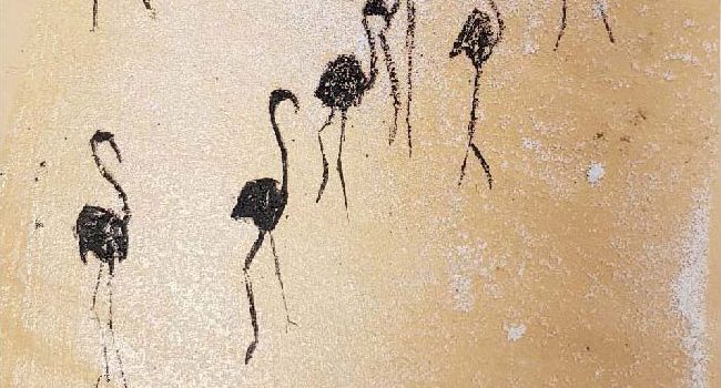 Avec Claudie, tout est une question d’expérimentation et de perception exprimée par différents moyens. Des remparts sur une feuille pré-encollée avec du gros sel? Ou de la bougie pour garder la réserve blanche pour l’encre? Et pourquoi pas de la betterave pour le rosé des salins?